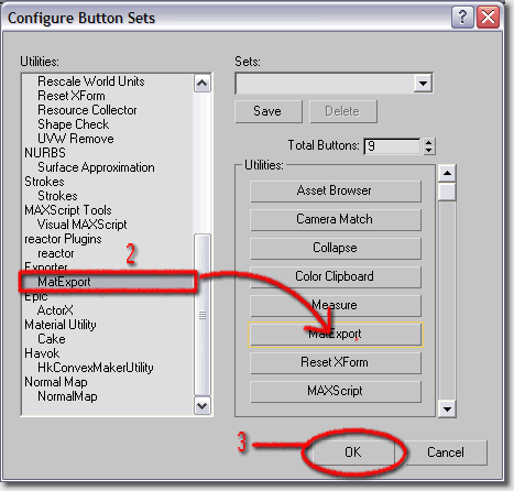 - 4.2 Click and drag the 'MatExport' entry to a button you want to overwrite in the Utilities panel in the rightmost part of the window, and voila! a MatExport button has been added to your Utilities (a.k.a. Hammer) Panel.