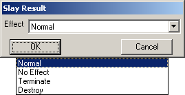 No Effect effectively makes the object invulnerable, Normal is the normal effect, and Destroy causes the object to completely disappear. Terminate is unknown.