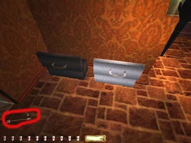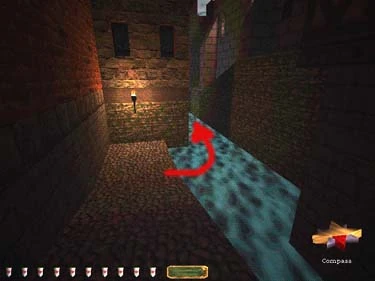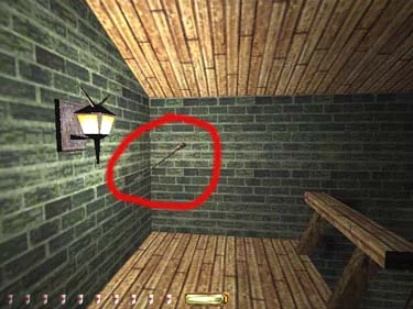 Grab the arrow, but don't switch to another weapon - this only works so long as the arrow is armed (it disappears if you disarm the weapon or change to a different weapon). You can now shoot this arrow into walls, guards, water, etc. and always recover it (figures 11 and 12). Pretty neat, huh?