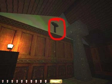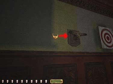 In the weapons room on the second floor, you will find a target above the room door (figure 11). Shoot this target with a broad head arrow to reveal a gas mine.