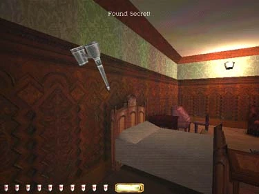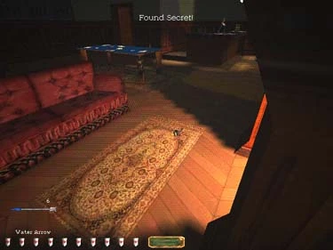 This secret only appears on the Hard and Expert difficulty levels. To access this secret on Hard, you should shoot a broad head arrow at the target on the wall in the game room (it can be seen in the far right of figure 10). Make sure you hit the bulls eye. To access this secret on Expert, use a water arrow to clean up the mead spill in the game room (figure 9). In both cases, the cray-man's head on the wall will slide away, revealing a golden necklace (figure 10).