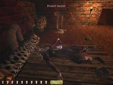 There are two ways to access the underground dungeon in Truart's house. The first way in is by dousing the fire in the dining room with a water arrow and then looking in the back of the fireplace for a switch (figure 4). The floor moves away revealing a short drop down to the dungeon. Another way is through the chapel altar secret. In this area you will see a small passage blocked by a wooden board - you can break this board with your sword. At the end of this passage is a metal grate and a small button on the wall - push the button and you will emerge in the dungeon (figure 5).