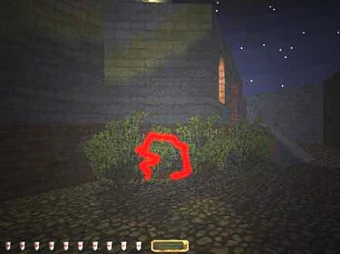 Go back the way you came and head north to the main gate. Hide in the shadows near the first door, pick it and climb up to the gate switch. Climb back down and shoot a few broad head arrows to the north, drawing the guards away. Slip through the gate, go east toward the front door and douse the two torches on the porch. Wait for the patrol to pass, then head left around the porch and find the crack in the wall behind the shrubs (figure 3).