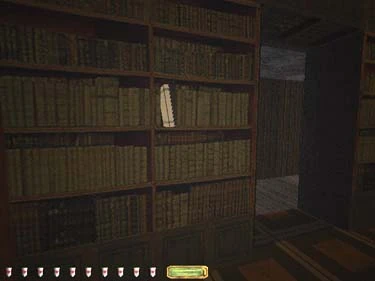 Head to the north hall and take the first left to the room at the end of the hall. Frob the book on the left (figure 8) for a healing potion. Crouch past the guard room in the hall (you can also grab his estate key if you don't already have one). The next room on the right has a vase, and there's a noisemaker in the closet in the room at the end of the hall. Grab the coins from the card tables in the game room, then use a water arrow to clean up the mead spill (don't forget to grab the jeweled cup). When you clean the rug, the mounted cray-man head behind you will move to the left revealing a necklace (figure 9).