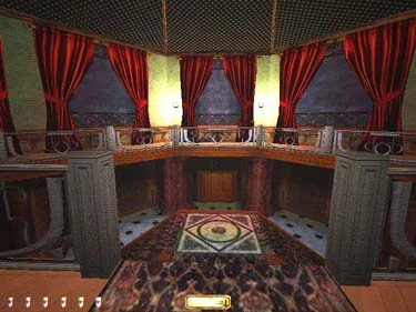 You will need a few moss arrows to get started here. Wait for the conversation to end, then cover the floor. The maid stays at the sink, but the male servant walks back and forth from the ballroom (he has an estate key you will need). There are also two patrols moving clockwise around this level - one has a gear you will need to reach the second floor. Grab the goods in the sink and go clockwise to the mess hall. Across the hall is the plant nursery with a moss arrow. In the ballroom there are some plates on the marble and a sleeper on the floor - don't wake him. Head back out and north up the hall - jump the tile sections or the whole detachment will come looking for you. Go to the bedroom at the end of the west hall and frob the torch mount to open the floor compartment (figure 4). In the other bedroom, go through the back door and slash the banner on the right to get into the chapel. At the altar, shoot an arrow into the overhead keyhole, and climb down the ladder (figure 5).
