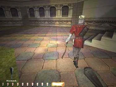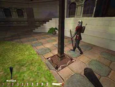 A: Believe it or not, you can unlock the front double doors with only slight comment from the two stationary guards outside. Wait until the patrol is close to the front gate, then slip around behind one, then the other (these should count for two of your blackjacks). Crouch and jump to the marble walk, then run to the grass, staying behind the patrolling archer. When he passes the gate, grab the loot from the middle of the yard, then follow close behind him on the grass. When he passes the light by the front doors (see figures 9 and 10), you can grab his key.