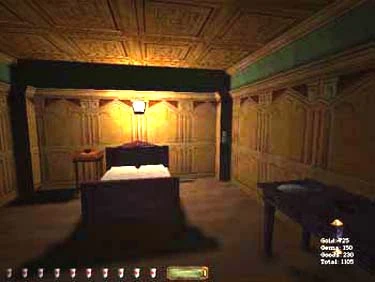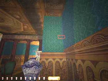 Inside the upstairs bedroom of the East wing, look for a hidden switch underneath a plant stand (see figure 3). This switch opens a wall safe above the bed (see figure 4). This safe contains a golden tiara worth 75 gold and 100 gems.