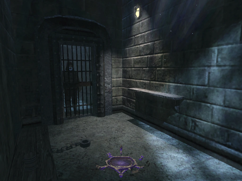Garrett's dank cell, with Warden Stout in the background, and the only available weapon or tool, the Light Gem.