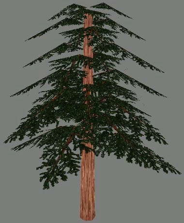 The Giant Sequoia is a rare tree, but is relatively abundant around the Pagan Village in Trail of Blood. Some of these trees have a diameter larger than six men, and one supports a promenade deck of about three shoulder-to-shoulder spans all around. Their trunks have a very slight taper (with no peak due to DromEd's sky-height restrictions) and are placed unrealistically close together for their size, as real trees in this condition would have choked each other out long since.